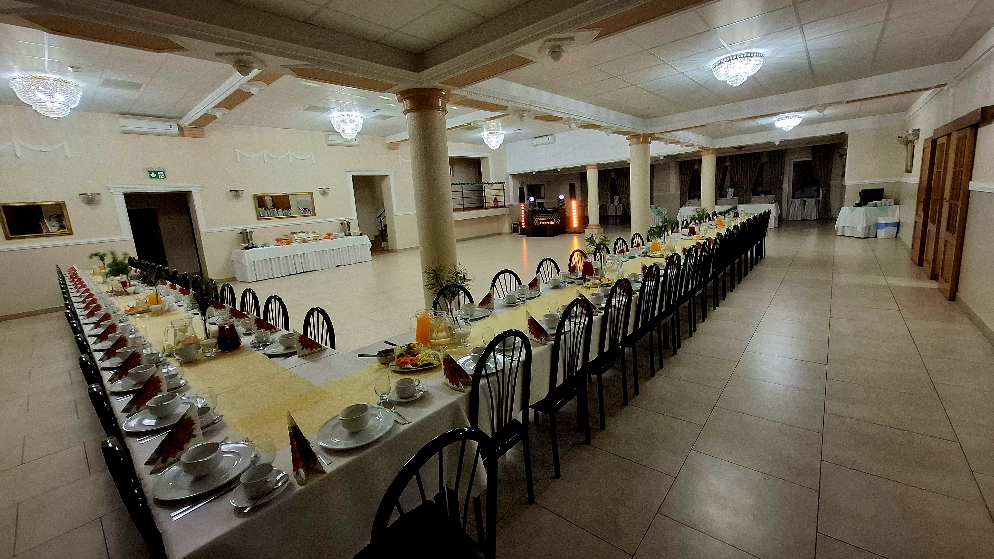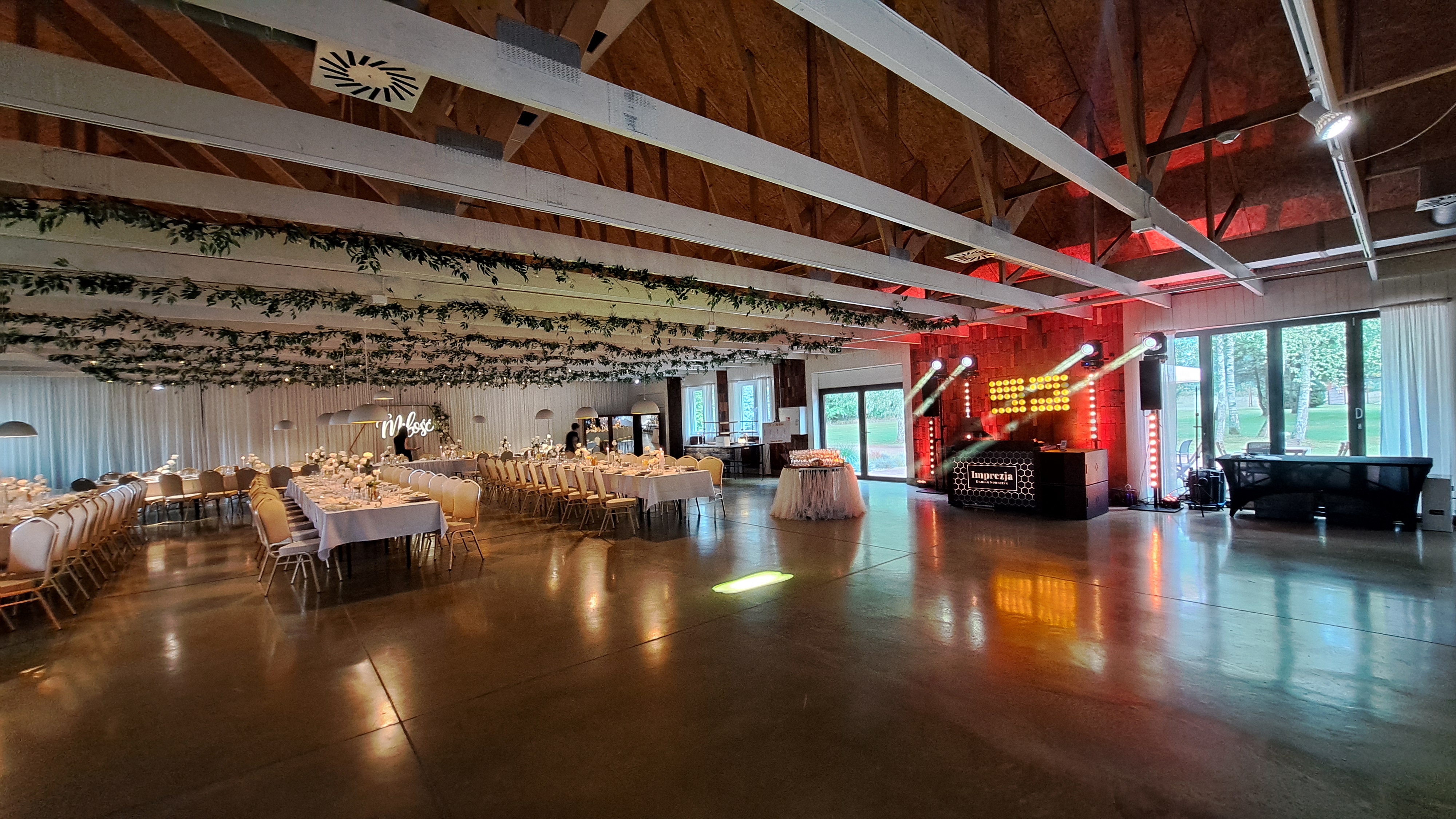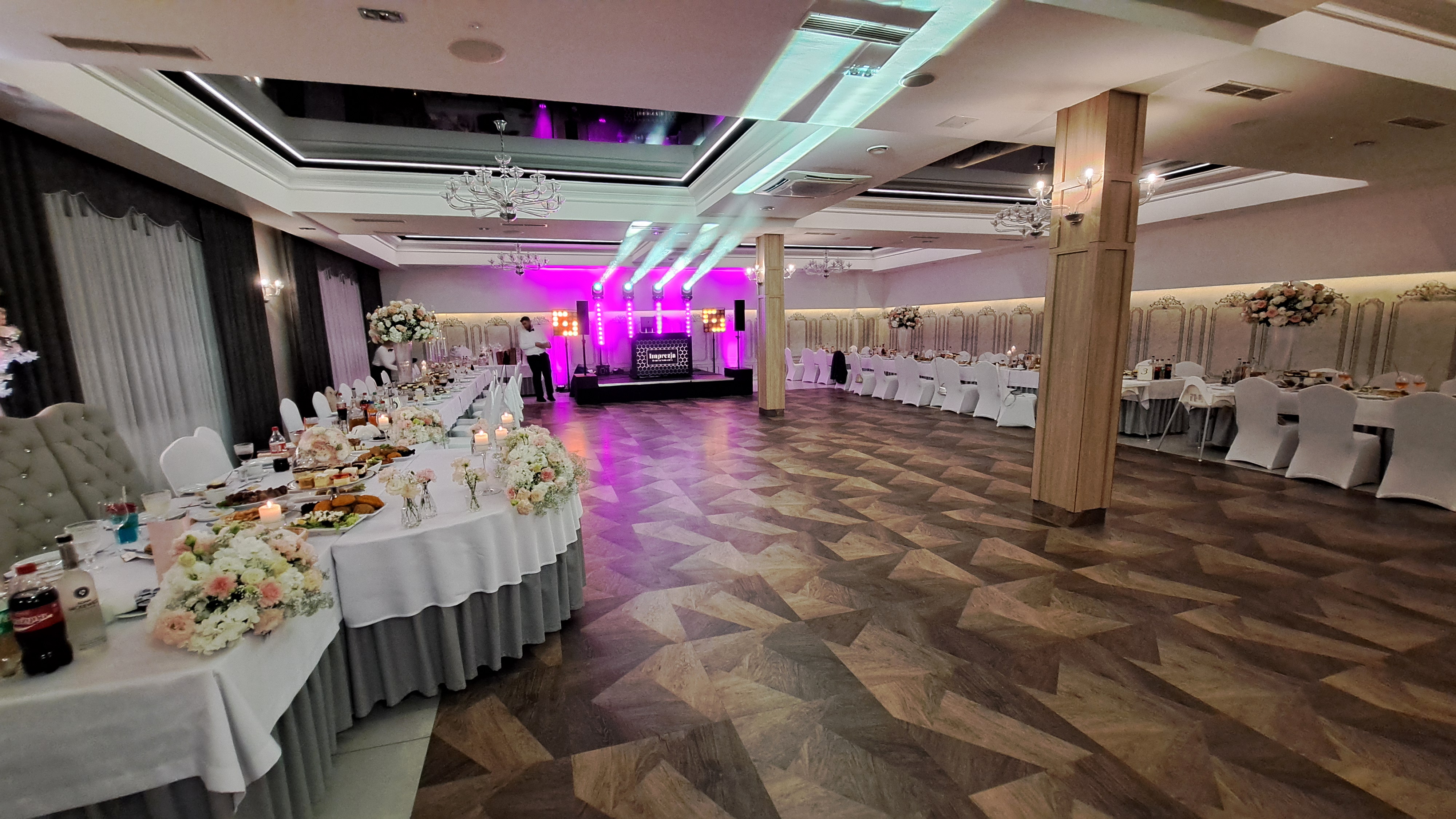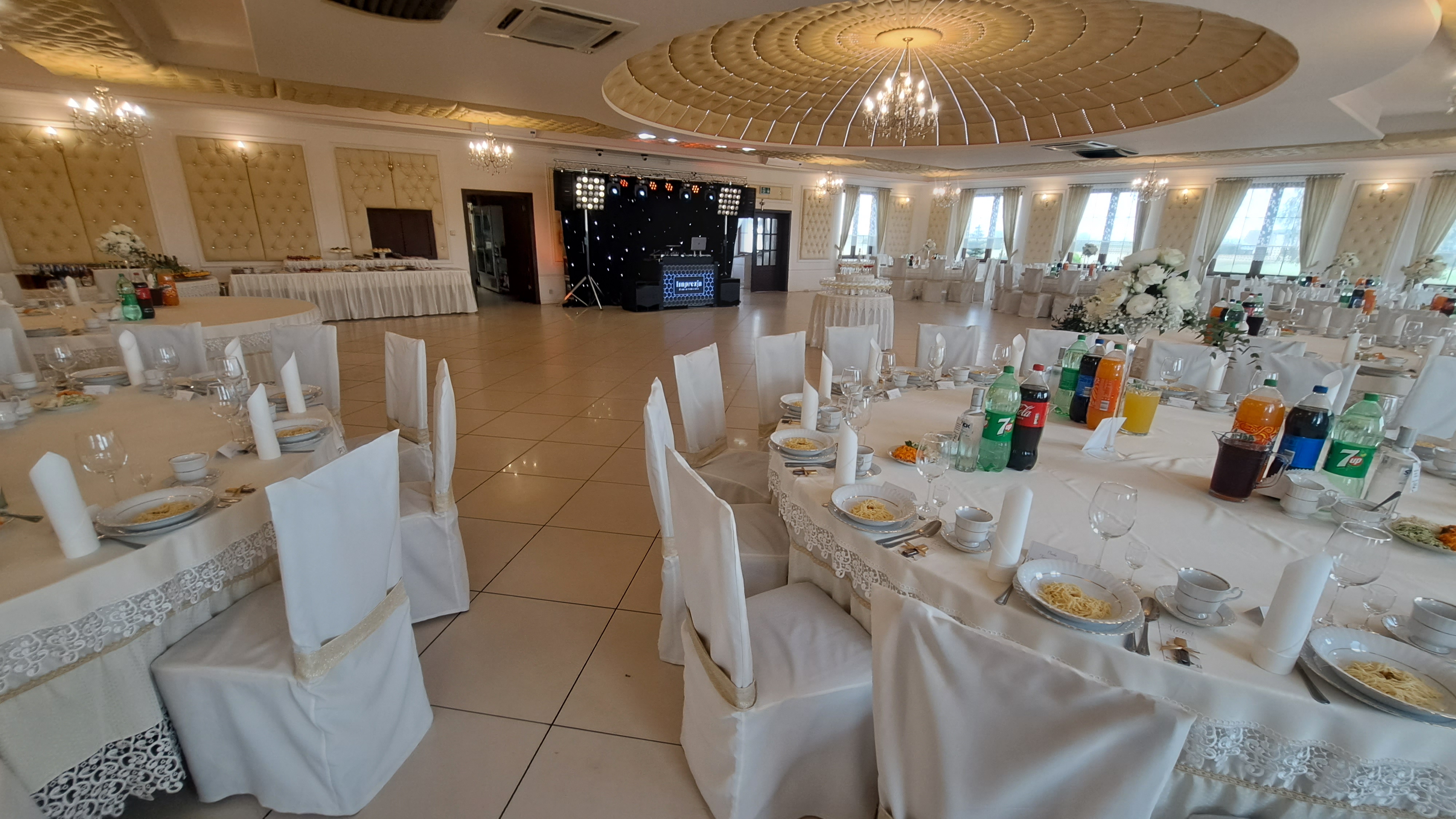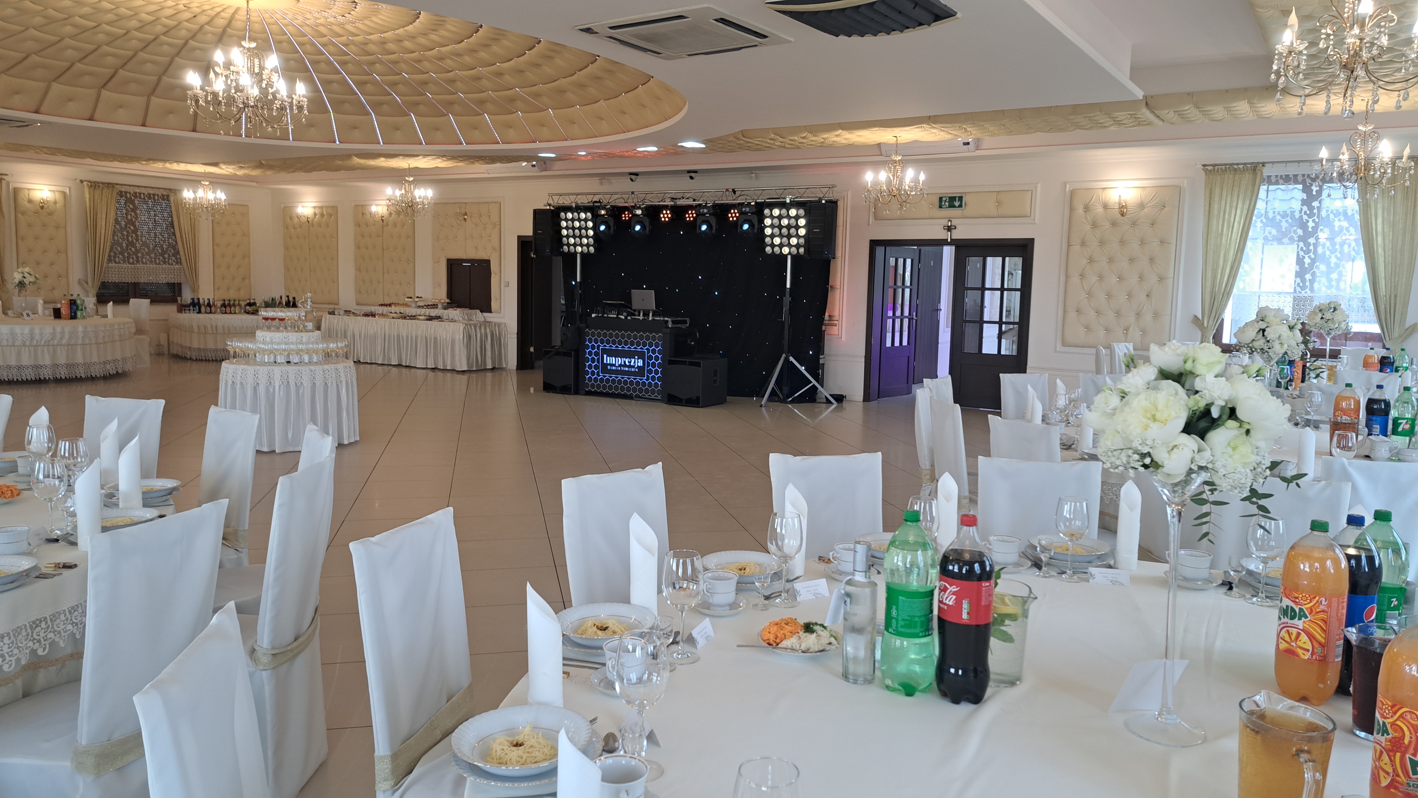 Ciekawe miejsce na weselnym szlaku. Lokal nowy i jeszcze parę rzeczy wymaga dopieszczenia 🙂 Jednak to co zastaliśmy pozytywnie nas zaskoczyło. Sala bardzo duża i ustawna. Zmieści spokojnie ponad 200 osób przy okrągłych stołach. Rada dla kolegów DJ-ów. Ze względu na długość sali zalecam zabrać bezprzewodowe nagłośnienie z linią opóźniającą. Sala ma grubo ponad 60 m długości.