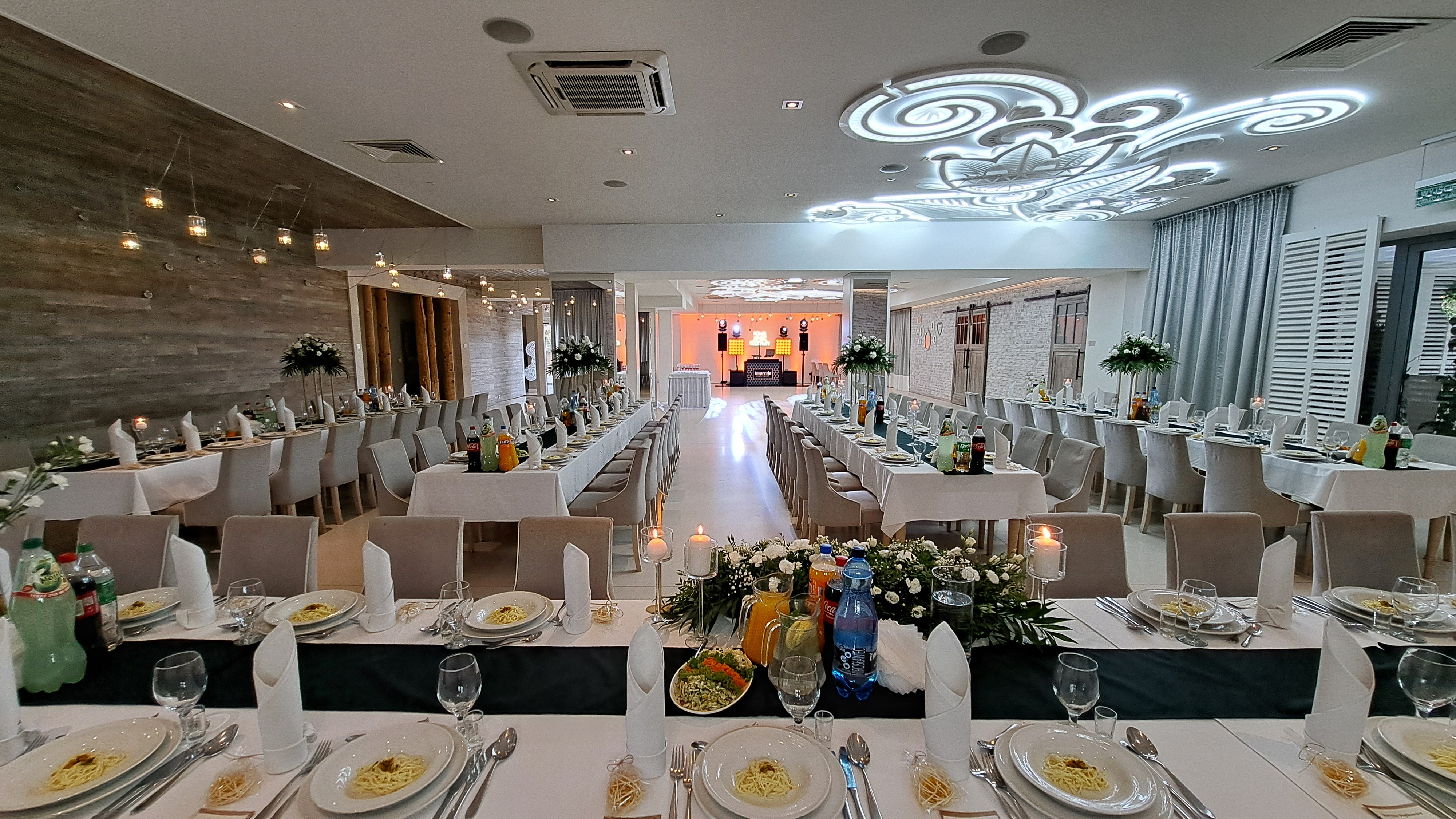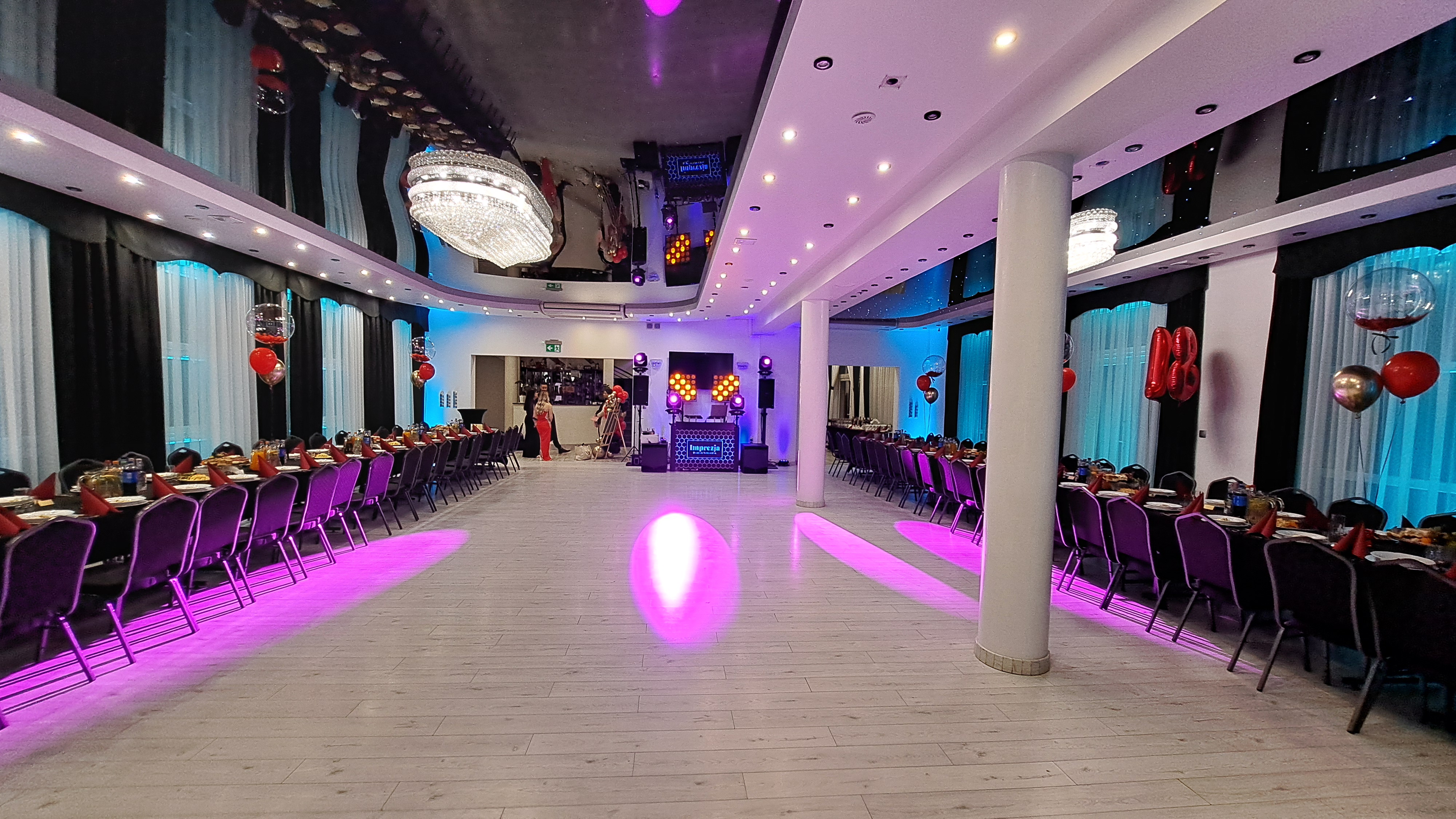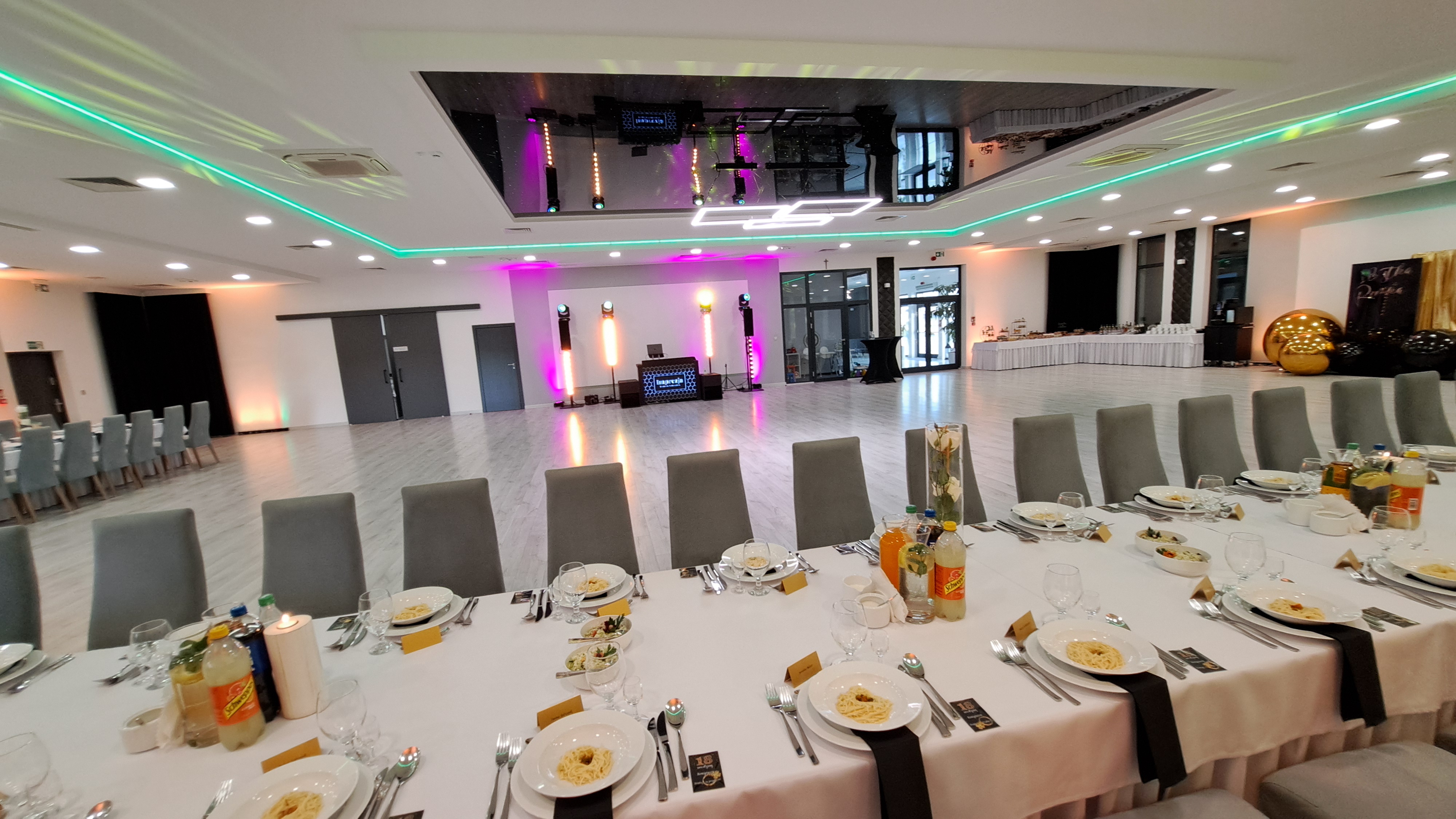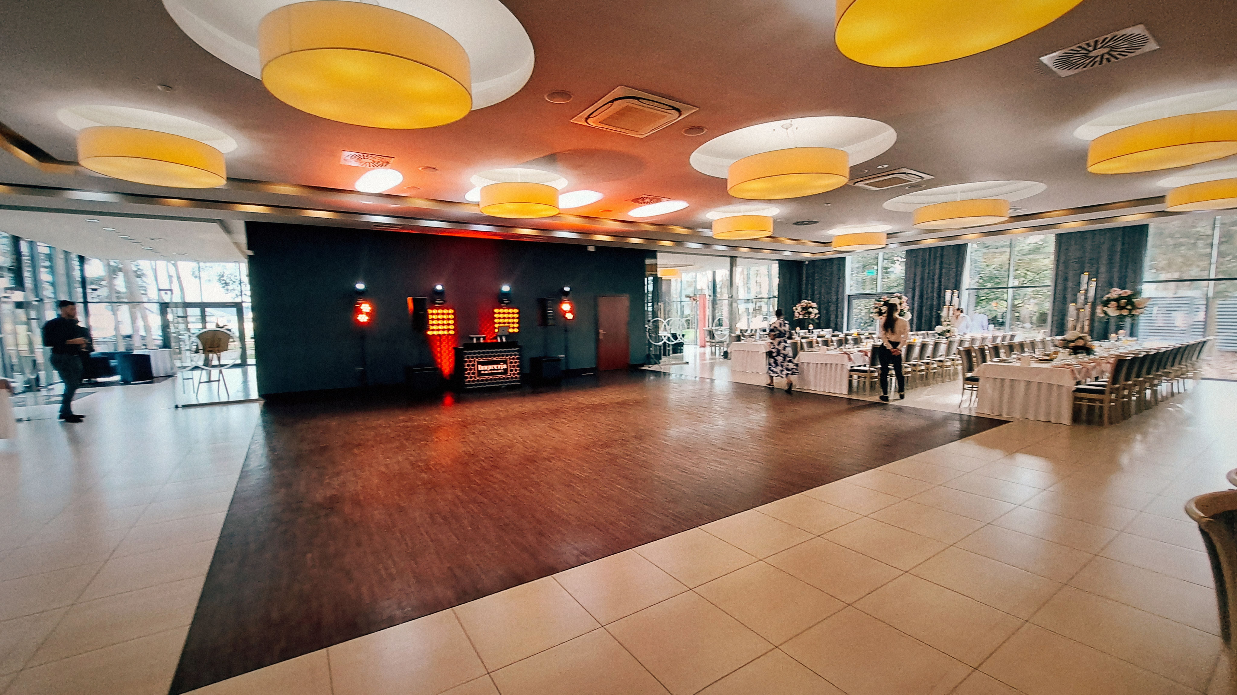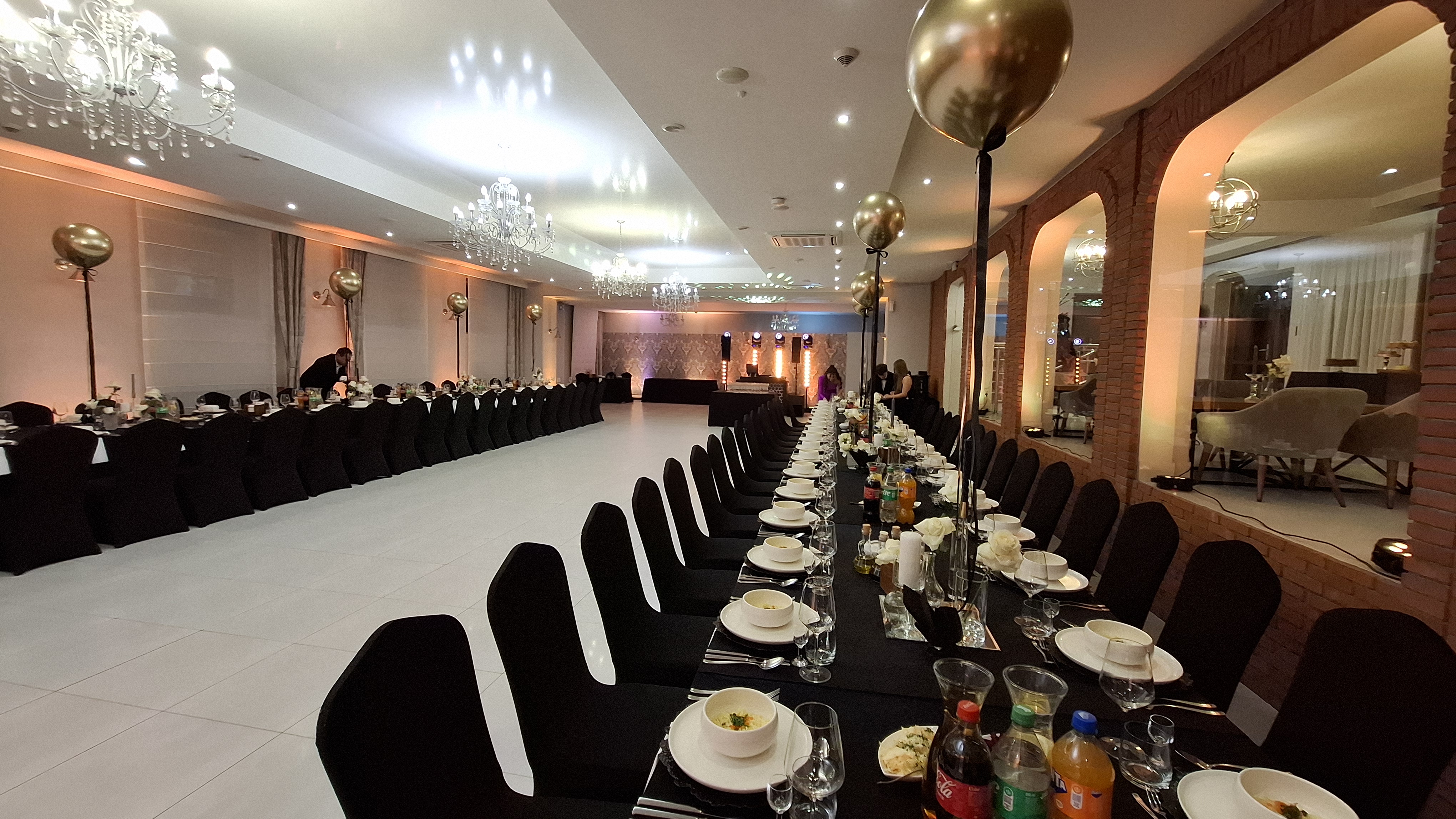 Ciekawe miejsce na weselnym szlaku. Lokal nowy i jeszcze parę rzeczy wymaga dopieszczenia 🙂 Jednak to co zastaliśmy pozytywnie nas zaskoczyło. Sala bardzo duża i ustawna. Zmieści spokojnie ponad 200 osób przy okrągłych stołach. Rada dla kolegów DJ-ów. Ze względu na długość sali zalecam zabrać bezprzewodowe nagłośnienie z linią opóźniającą. Sala ma grubo ponad 60 m długości.