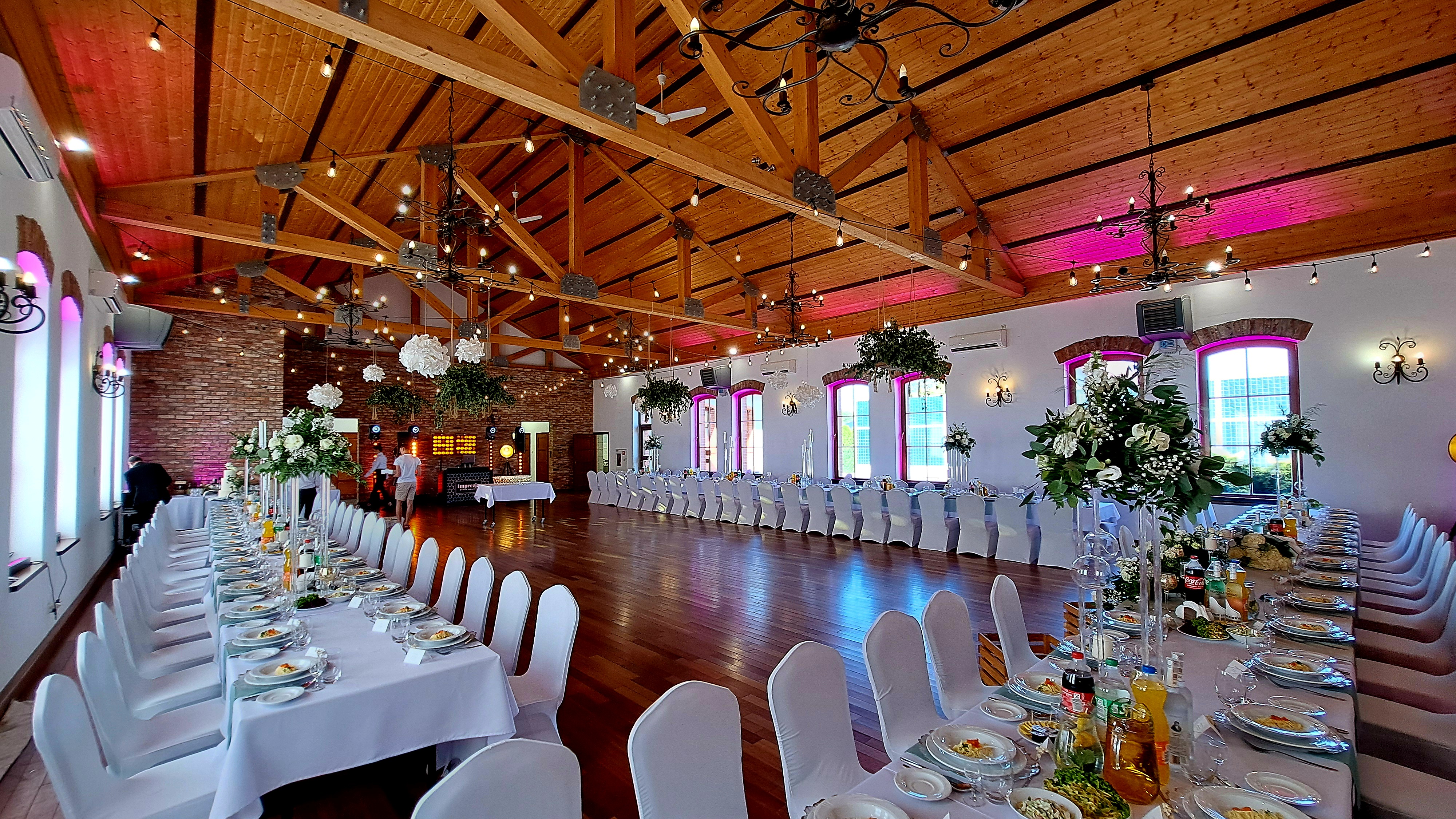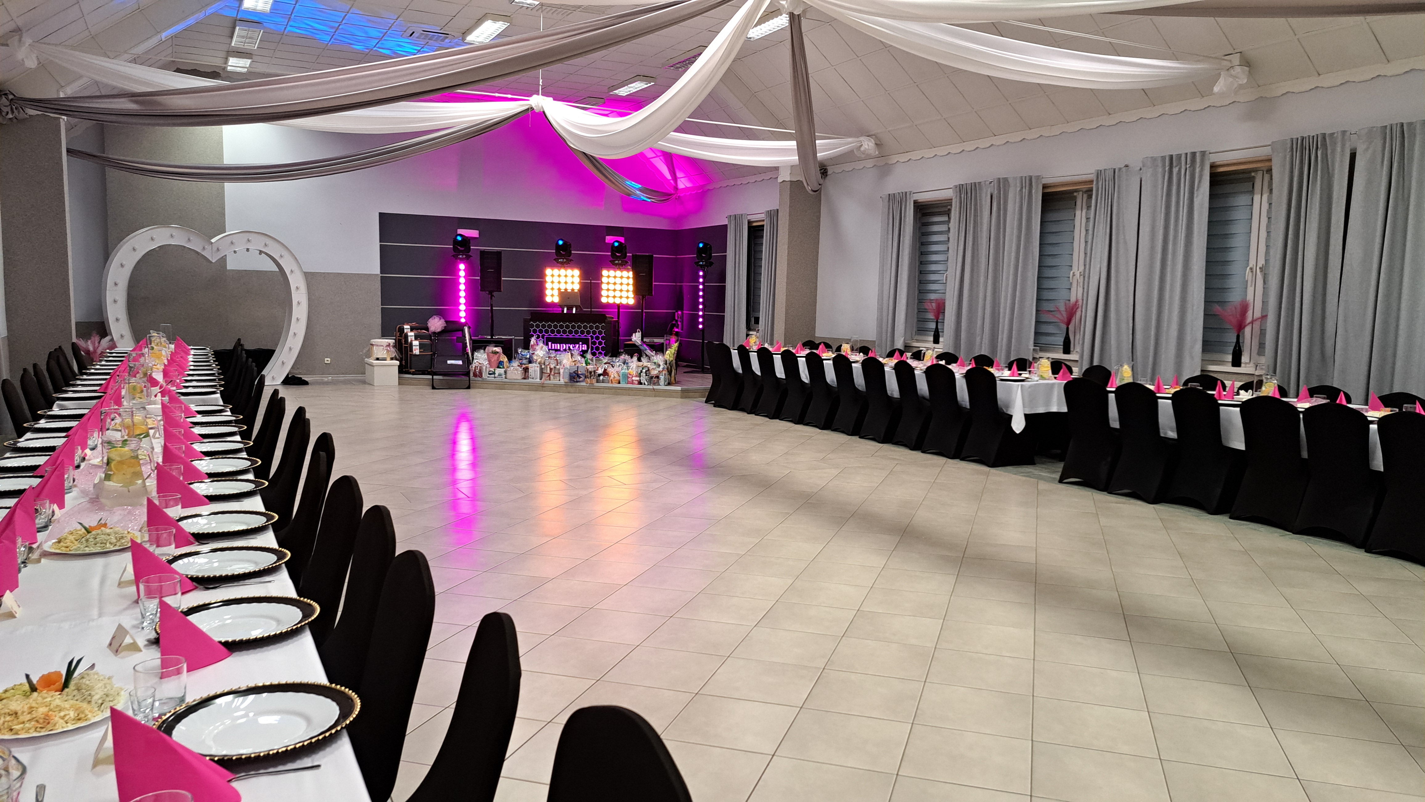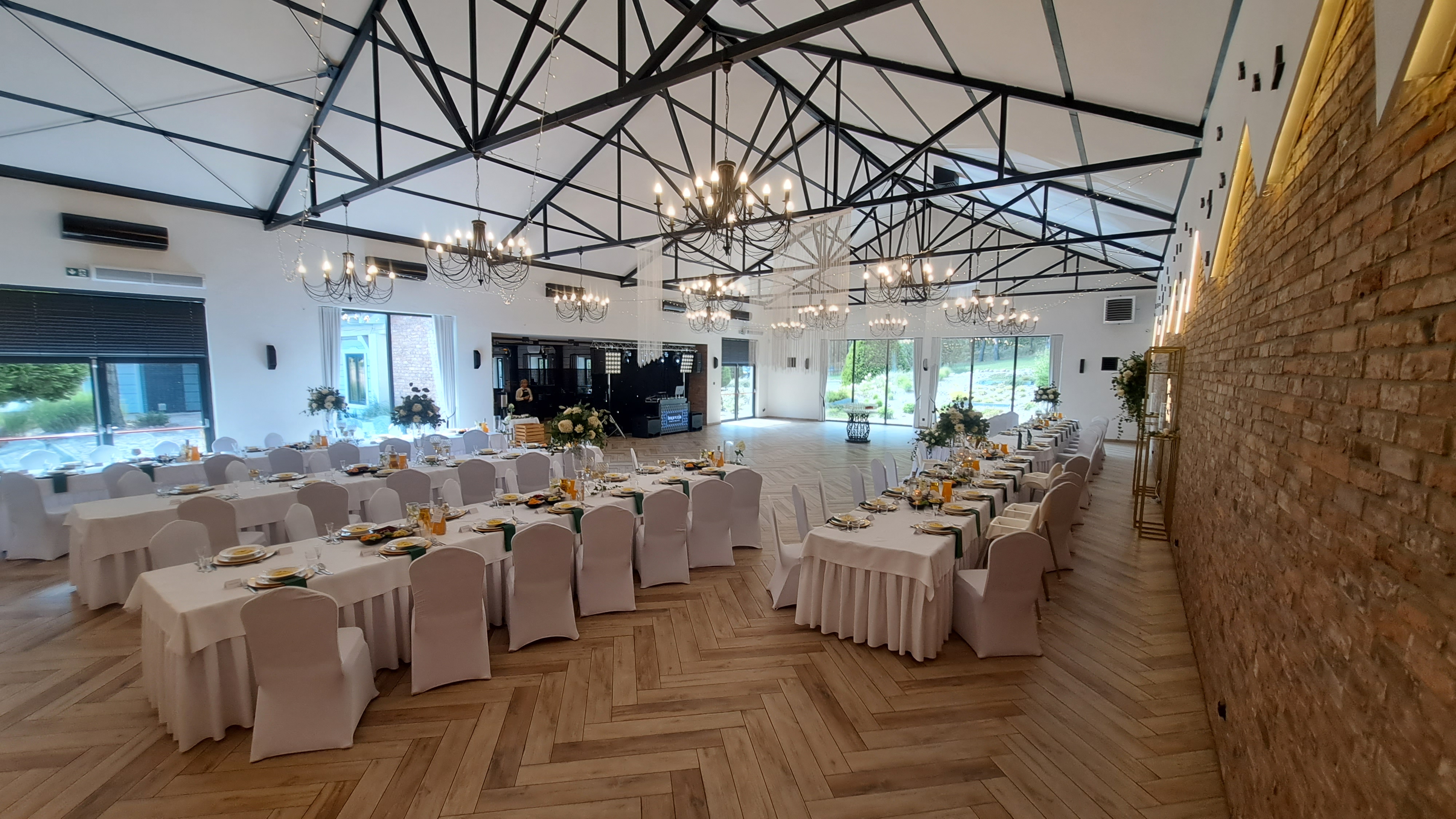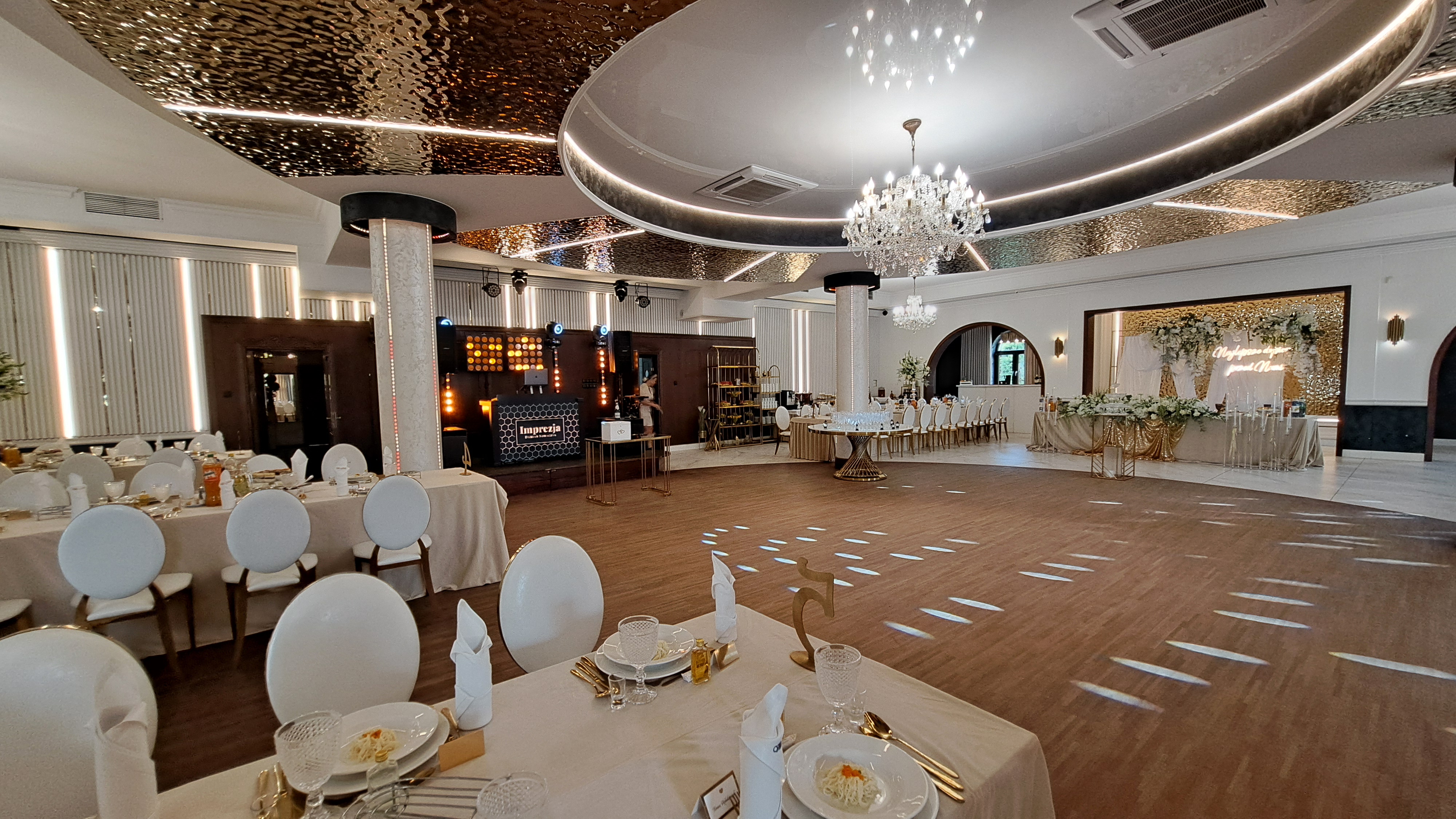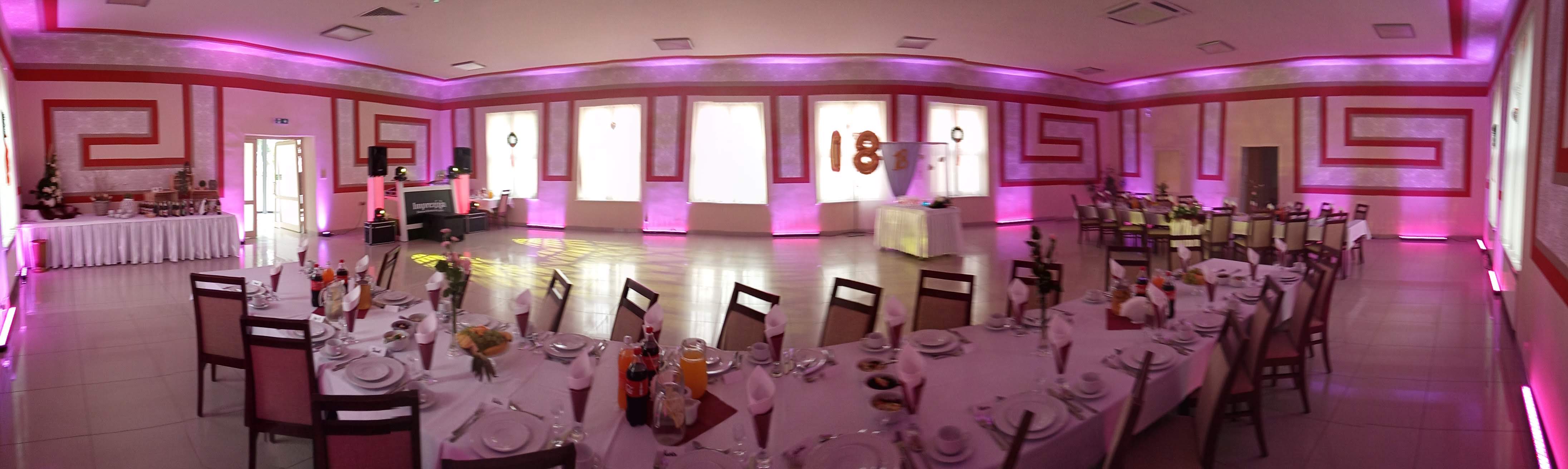 Ciekawe miejsce na weselnym szlaku. Lokal nowy i jeszcze parę rzeczy wymaga dopieszczenia 🙂 Jednak to co zastaliśmy pozytywnie nas zaskoczyło. Sala bardzo duża i ustawna. Zmieści spokojnie ponad 200 osób przy okrągłych stołach. Rada dla kolegów DJ-ów. Ze względu na długość sali zalecam zabrać bezprzewodowe nagłośnienie z linią opóźniającą. Sala ma grubo ponad 60 m długości.